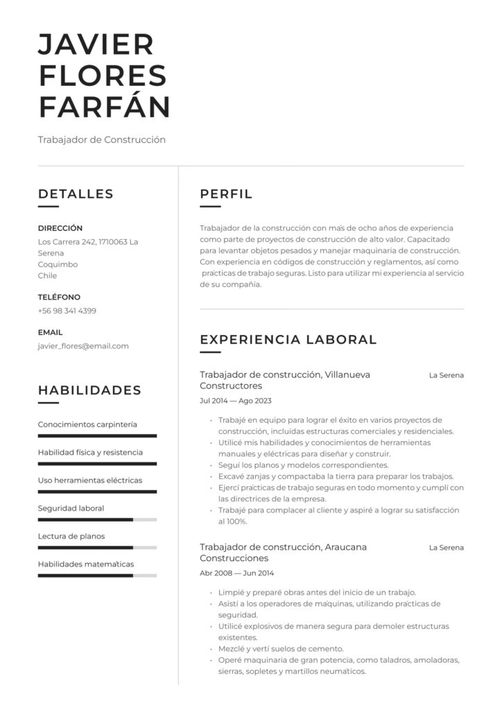 Esta sección es crucial. Enumera tus trabajos anteriores en el campo de la construcción en orden cronológico inverso, comenzando por el más reciente. Para cada puesto, incluye: